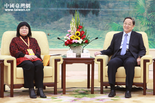 16日上午,俞正声在北京人民大会堂会见了出席“2014海峡两岸工会论坛”的台湾工会界代表。图左为海峡两岸劳工发展交流协会理事长侯彩凤 。(中国台湾网 于斯文 摄)