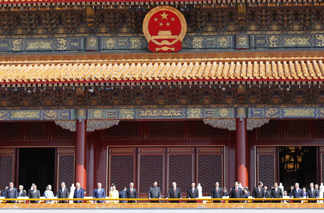 上午9时55分,习近平等中外领导人来到天安门城楼主席台,向广场观礼台上的各界代表挥手致意,全场5.5万人爆发出雷鸣般的掌声。