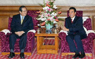8月16日,中共中央台湾工作办公室主任陈云林(右)在北京会见中国国民党中央政策委员会执行长曾永权(左)率领的国民党“两岸客货运包机促进访问团”。 新华社发(廖文静 摄)