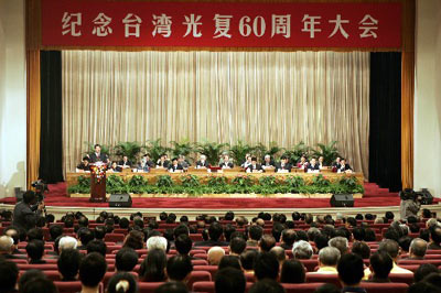 今天,是台湾光复60周年纪念日。我们在这里隆重集会,纪念台湾重新回归祖国、摆脱日本殖民统治60周年,庆祝这一让所有中华儿女扬眉吐气、欢欣鼓舞的伟大胜利,具有十分重大的意义。