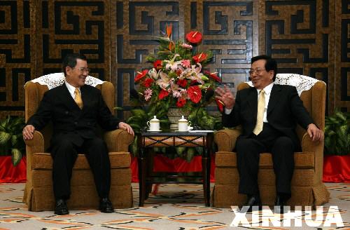 4月21日,中共中央政治局常委、国家副主席曾庆红在海南博鳌会见前来出席“博鳌亚洲论坛2006年年会”的台湾两岸共同市场基金会董事长萧万长。 新华社记者陈立群摄