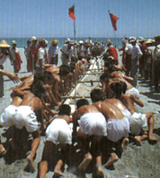 因应着四时的运转和作物收成,传统的阿美族人一年到头,都有相应的祭典,尽管随着时代的变迁,祭典已大幅精简,但属于阿美人精神的血脉,仍在歌舞、捕鱼中代代相传—— 阿美族世居于台湾东部的平原和海滨地带,为原住民九族中的最大族群,现有人口约13万人,分布在花莲、台东县,另有零星族人居住在恒春半岛上。根据学者研究,阿美族属于南岛语族,其祖先可能系自菲律宾或马来半岛一带迁徙来台;而依照族人自己的传说,他们的祖先原本居住在远方,后来家乡遭遇大洪水,一对兄妹跳上了木筏漂流得救,并在东台湾繁衍子孙。 在阿美族传统中,财产继承大权操在女性手上,婚姻也是采招赘制,子女一律从母姓,可说是典型的母系社会。然而另一方面,以部落为单位,一切公共事务则是由男性来担当,祭祀活动更以男性为主体,女子若非被排除在外,便是仅具陪衬角色,巧妙地平衡了男女间的权力。 在阿美族部落里,成年的男子均被纳编入年龄阶级的体制中。年长者负责决策、发号命令,中壮年负责执行及督导下一代,而体力劳动、跑腿等杂役,则由青年组担任。每至丰年祭,青年组都要聚集到“青年会所”,接受团体训练,类似于兵役制度;而每隔3~8年不等,各部落会替年轻男性举行成年仪式,通常并入丰年祭活动一并举行。 尽管急剧的社会变迁正冲击传统的生活方式与社会伦理,但祖先精神仍透过祭典、仪礼、歌舞活动等代代相传,牵系着族人的向心力。 欢庆小米丰收的丰年祭 阿美族的传统祭典很多,但以一年一度的丰年祭规模最大,这是族人为了欢庆小米丰收、祭祀神灵祖先所举行的祭典,并负有教育男子成年、承传薪火的慎重意义;部分部落并借着递送槟榔、“牵手礼”等活动,撮合适婚男女。从前阿美族人的主食是小米,祭典的时机也配合小米的收成;如今则改以稻米的收割季节,台东地区约在7月份,花莲地区则多在8月举行。 一个完整的丰年祭包含了“迎灵”、“宴灵”和“送灵”三个阶段,之前之后都要举行捕鱼仪式;不过在基督教传入及社会变迁等诸多因素的冲击下,缩短日期、简化宗教仪式已成了共同的趋势,取而代之的是融入了相扑、拔河等竞技,甚至结合木雕、工艺的展示及美食巡礼,成为上下同欢的歌舞“嘉年华”,也是外人认识阿美文化的窗口。 改良过后的丰年祭,由于深具节庆性质,因此更适合一般游客参观、同乐。每个部落举办的丰年祭各有特色,短则1天,长则7天;之前的准备布置工作让部落里的人都忙了起来,家家户户酿制小米酒、糯米酒以飨宾客,并在社区活动中心或学校运动场架起守望台;活动期间,除了各项祭典、歌舞活动外,甚至融入拔河、赛跑、相扑、射箭等竞技比赛,整个部落为之沸腾。  歌舞活动是丰年祭重要的一环,也是时代演变下,族人无论如何不会废去的项目,因为它不但具有祭仪的意义,更是族人同欢同乐的社交活动。阿美族丰年祭歌舞有分男性专属、女性专属及男女合舞,各运用在不同场合;其中年轻男子担纲的“勇士舞”,是以大幅度肢体摆荡,表现出齐一的战斗性,非常具有震撼性。 其歌唱由长者发音,众人应和,如此不断反复,而众人也手牵着手围成圆圈,面向圆心作逆时针的进行。各部落均有其独特传唱歌舞,然而由于平时不得练唱,又禁止向其他部落学习,因此流失情形相当严重,目前以大港口、宜湾、奇美、马兰、都兰等地的歌舞保存较为完整。 也有若干部落,至今仍坚持传统仪式,并按“年龄阶级”运作不辍。这些部落大多位在沿海或山区,如丰滨、大港口、胆曼、白桑安、宜湾、奇美等,由于地理较孤立,反而成为维系阿美文化的中流砥柱。  以奇美为例,丰年祭一共持续5天,旅居外地的族人均会返回部落,共襄盛会。头两天可以算是准备期,首日要向外“报信息”,宣告活动开始;接着第二天,青年们上山采回黄藤等野菜,准备成丰盛的午餐,邀全村男性一起享用,而长辈也借此机会,教育年轻人团结合作的重要。第三天晚上,全村男子共舞迎灵,祭典正式揭幕,一般来说,迎灵的活动比较严肃,外人也较不便参与;之后两天的白天,青年组的组员将前往级友家“巡访”,夜间举行的宴灵、送灵歌舞,亦加入了女性的歌舞,欢乐气氛逐渐展开。尤其最后一天更是年祭的高潮,族人热情邀请宾客加入圆圈共舞,傍晚时会举行盛大的“办桌”,用槟榔叶鞘盛满丰富菜色,所有来宾皆可与族人共享美酒佳肴。 遥拜祖先与亡灵——捕鱼祭•舟祭 捕鱼祭是阿美族另一项重要的仪式,起源于阿美祖先乃从海上漂流到东海岸,为感谢海神一路护佑、并得以繁衍子孙而举行。这项盛典多于6、7月收割季来临前举行,祭拜海神、祖先与海上亡魂,并祈求渔货丰收;而丰年祭的活动,往往也以捕鱼作为开始和结束。 捕鱼是男人的责任,对阿美族人来说不仅是经济活动,更是重要的仪式和文化传承。以年龄划分阶级的阿美族人,从捕鱼一事中建立长幼生活经验传递,并教导少辈了解及尊重自然生物,男性也从中强化自身对家庭的责任。 捕鱼祭传统上多选择望日举行,因为在月光照耀下,捕鱼工作进行较顺利;如今祭典多改到白天,并且为了提高族人参与率,通常会安排在周末假期。捕鱼祭限男性参与,开始时先以巫师用酒喷过的槟榔叶镇邪驱魔,并进行拔河比赛,接着进行渔捞;男子们带着渔网、渔具及祭品,居住在海滨者驾着船筏下水,内陆地的族人则将溪流围堵起来