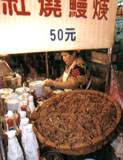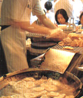 基隆庙口小吃是指位于奠济宫附近仁三路和爱四路的小吃摊,约成“L”形,总长约4、5百公尺的区域,聚集不下300多个摊位,经过数十年的演变,这里的摊位不仅按顺序编了号,连招牌都整齐划一,各式小吃种类繁多,各家皆以独创口味招揽顾客,口碑远播,致使基隆庙口小吃名闻全省。 奠济宫建于清风吹清同治12年(1873年),乃漳州籍先民为纪念来此开垦的先祖而建,香火鼎盛,但自从小吃摊声名大噪后,已有油烟盖过香火之势;然于大啖美食之余,别忘到奠济宫细细鉴赏这座百年庙宇,一窥先民精致的雕琢艺术。 庙口小吃以仁三路的摊位历史较久,有很多是日据时代就流传下来的,共聚集了70多家小吃摊,皆有固定的摊位 整齐的招牌,自白天就开始营业;着名的小吃有独树一帜的虾仁羹、天妇罗、泡泡冰、豆签羹和三明治等,都让人垂涎不已。 兴起较晚的爱四路则被规划为流动摊位区,但每摊位置固定,较具代表性的摊位有八宝冬粉、奶油螃蟹、原汗猪脚大王、红烧鳗羹,以及全家福的甜酒酿和元宵;后半段摊位则以服饰、鞋子、玩具、日用品为主,而与仁一路交接处,也有几摊老字号的小吃,此路段于下午4点半左右才开始营业。夜市白天时可通行汽、机车,下午5点开始管制,成为行人徒步区,因此游客最好在傍晚前来,最能感受庙口夜市的魅力。 天妇罗 地址:仁三路16号摊位 营业时间:1100~2100 天妇罗是一种日本食物,意指“炸的东西”,其实就是甜不辣,也是基隆庙口最负盛名的小吃之一。庙口卖天妇罗的摊子有好几家,其中以编号16号的摊子最为老牌,且味美料好。每家皆采现做现炸,以鱼浆加上面粉、太白粉,再以糖、盐调味,用机器搅匀后,再用手捏制成形丢进油锅,配上甜酱、小黄瓜,既是一份香酥可口的美食。 豆签焿 地址:仁三路26号摊位 营业时间:0900~2230  豆签焿是基隆小吃的特产,主要原料为“豆签”,是以状似黄豆带有黑斑的米豆,磨成粉后加工制成面条状,但比一般的面条短而薄,便是所谓的豆签,再与鱿鱼羹、虾仁羹一起在汤里煮,其汤汁则是以虾仁、蚵仔等材料一起勾芡烹煮,料多实在,值得一尝。 红烧鳗焿 地址:爱四路9号摊位 营业时间:1600~2400 这家已卖了30年的红烧鳗焿,是庙口最有名的小吃之一,它是用新鲜的鳗鱼去头、骨刺后切成块,沾上调味料去腥再裹上面粉油炸红烧,然后放入大锅中和白菜、香菇一起勾芡烩成,鱼头则煮成当归鳗鱼头,风味鲜美醇口,是喜爱羹汤类食客不可错过的佳肴。 全家福甜酒酿元宵 地址:爱四路24号摊位 营业时间:1700~2400  全家福的甜酒酿元宵完全是手工自制,在基隆非常知名。所谓的“酒酿”,是用白色的小糯米泡酒酿制而成,而全家福的酒酿,在香醇的酒味中还掺杂着淡淡的桂花香,尝起来酸酸甜甜的,再加上各式手工包馅元宵,就是一碗热乎乎的甜酒酿,此外,也可买生元宵回家自煮,惟冬至、元宵时节,可得事先预订,否则一颗难求。 (来源于:华夏经纬网)