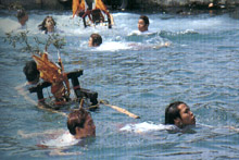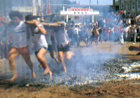 过火仪式在大陆闽南一带行之久远,多半是伴随寺庙的祭典举行。台湾的宗教信仰沿袭自闽南,故各地也时有过火仪式,但论及规模,当属台北县万里乡野柳村所举行的最为盛大隆重。这种水里来又火里去的酬神仪式年年不断。  野柳保安宫在海年农历正月十五举行过海过火仪式,除了本地人动员投入外,外地人也能参加。过海仪式首先进行,抬轿组先抬着神舆在庙前绕行,道士在一旁诵经祈祷,待抬轿的信徒进入浑浑噩噩的起乩状态时,道士一声令下,轿夫便纷纷抬着神轿跳入海中,游过约100公尺后,抬轿上岸,然后向预定过火的地点跑。  过火之前同样也有一连串的仪式。首先由道士向火祷告,祈求平安顺利,然后以草席在火堆四周挥舞,象徵驱魔;再以盐和米撒入炭火降温。此时,抬轿组开始绕着火堆跑,边跑口中边发出呓语,不久,在道士一个信号下,神轿开始过火,随后一些信徒或身体有恙者也纷纷冲进火堆。 仪式完成后,神轿在信徒的簇拥下,在野柳的大街小巷内巡行驱魔,待神轿回宫,整个活动才告落幕。 乘车风向标: 1.自淡水搭往基隆的台汽客运,于野柳站下车,步行至野柳渔港即抵保安宫。 2.由基隆火车站旁搭往金山、淡水的台汽客运,或搭往金山的基隆客运,于野柳站下车,余程同上。