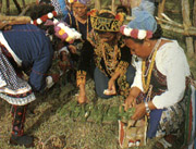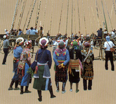 排湾族原住民目前约有4万人左右,为台湾原住民中的第三大族,分布于屏东、台东两县,排湾社会中有贵族制度,并有世袭法,在竹竿祭中充分反映出来,而使祭典独树一帜。 传说排湾族发源于大武山,祖灵依部落垦拓先后依序巡访,每轮需时5年左右,故以祭祀祖灵为旨的竹竿祭,便5年举行一次,所以又称五年祭,是排湾族社会最重要的祭典;但目前仅屏东县来义乡的古栖村和台东县达仁乡的土坂村仍保有这项祭仪,其中又以土板村的竹竿祭,保留了较完整的面貌。  整个仪式分前祭、刺球祭及送神三大部分。前祭部分以女巫在祖灵屋内向山、河神祈求平安开始;事前,女巫们亦在村外搭设竹棚,供恶灵栖身,以防其进入村中干扰祭仪。布置妥当后,族人们诚敬地邀请祖灵降临,与族人同乐。  祭典的高潮是最后一天的刺球祭,刺球用的竹竿长约8公尺,是由祭司、头目等人择定时间、地点砍取而来,使用前且须过火驱邪;竹竿的长度、纹饰因刺球者的身分而有别,所刺之球则以软藤编制,大小如垒球,并系上细绳,看起来既像球的尾巴,又像是扎着辫子的人头。典礼开始时,祭司将10颗分别代表不同意义的滕球依次抛向空中,只见二、三十支竹竿迎向场中,争相抢刺藤球,好不壮观。10球陆续接毕后,村中男丁进场自由抛掷藤球,这些自由球并无特殊意义,但须等到主管的竹竿刺中藤球后,仪式才告一段落。这时,刺球者齐将自己的竹竿劈断,持着竿头疾冲回家,因为他们相信,祖灵仍停留在竹竿上,这些竹竿日后也仅能供头目搭造房屋,一般人不得利用。 一番仪式后,族人恭送祖灵回到大武山,沿途绕经每户人家,传统上,各家各户会奉献小米糕,如今则有以现金、杂货代替者,颇似汉人舞龙、舞狮的习俗。仪式结束后,会进行盛大的歌舞活动,欢庆祭典圆满达成。 竹竿祭为期约5天,最高潮的刺球仪式在最后一天举行,通常是在每5年的10月25日。 乘车风向标: 1.自台东市复兴路、安庆街口搭往大武、安朔等地的鼎东客运山线班车,或自台车火车站前搭往高雄的台汽客运,在大溪站下车,转搭计程车或循往土坂的产业道路步行7.2公里可抵。 2.由高雄东站、屏东火车站旁或枫港搭往台东的台汽客运,在大溪站下车。 3.搭乘南回铁路的普通车,在泷溪站下车,余路同上。 特别提示: 排湾族人借竹竿祭祀祖灵、神明,仪式慎重,亦多有禁忌;参观者不可任意触碰祭祀用器物、擅闯祭场,摄影时并须注意不要干扰祭仪进行,女性游客尤应注意。