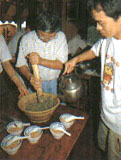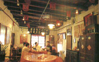 北埔在新竹各客家庄中,不仅以传统聚落、古迹保存完好驰名,在特产小吃方面,也因长期人文荟萃,及近年观光产业兴盛,而发展出精致多元的乡土风味。 北埔观光兴盛,特产小吃也颇为发达,一般常见的客家风味,如粄条、福菜、客家粿、姜丝炒大肠等,在北埔的餐馆食铺都可以吃得到;此外,农历9月还有独特的柿子大餐。而群山环抱的北埔,丘陵多,雨量丰沛,造就茶树极佳的生长环境,所产茶叶质醇味甘,享誉国际。除了一般品茗,北埔的餐厅、茶坊,以传统客家“吃茶”文化,发展出颇具特色的擂茶,浓郁的茶香、米香召唤着往来的游客。 擂茶 “擂茶”为海陆客家人特有的饮食习惯,由于其主要原料——米仔、茶叶,以及擂钵、擂棍等道具,轻巧易携带,客家先民由大陆渡海来台时,便将此项传统一起带到台湾来了。  擂茶的作法,是将绿茶、花生及芝麻等基本配料,依次放入擂钵里,以擂棍研磨,并不时加入少许冷水,续放入紫苏、香菜、食监等材料,约15分钟左右,擂钵里的茶浆变成墨绿色后,就可冲入开水一起食用,浓烈的米香、花香味,和着淡淡的茶香,吃起来别具风味。擂茶除搭配糕饼、米粿等茶点食用外,还可在研擂过程中加入米仔、四季豆、雪里红、豆干等配料,成为营养可口的正餐。北埔的擂茶店,以广福茶坊、北埔擂茶及番婆坑客栈最具代表。 芋头饼·蕃薯饼 清末民初,台湾物质缺乏,客家先民以芋头及蕃薯为馅,制成中秋月饼,从此成了客家糕饼的代表。来到北埔的游客总要带上几盒,隆源、瑞源、新合春都是近百年历史的老店,强调纯手工作法,制作出来的芋头饼及蕃薯饼,油而不腻,皮酥而不焦,内馅绵细,入口即化,其中瑞源所卖的芋头饼及蕃薯饼,因甜度较低,较符合年轻人的口味。 柿饼·柿子大餐 九九饮食店 地址 南兴街152号 电话 (03)580-3226,580-2305 营业时间 1100~2030 店内特色 柿香糯饭、柿醋溜鱼、柿子鸡汤 北埔的柿饼名气虽不及新埔,但当地餐厅业者巧思融合客家菜肴的美味与柿饼的清香,开发出一道道风味独特的柿子大餐,蔚为当地特色。传统客家菜味道咸重,而风干过的柿饼则具有独特的甜香,结合两者的柿子大餐清香爽口而不油腻。北埔推出柿子大餐的餐厅以九九饮食店最道地,每年10~12月柿子飘香时节供应。 广福茶坊 地址 北埔村10号 电话 (03)580-4543 营业时间 1000~翌日0200 店内特色 擂茶  与天水堂二房对街相望的广福茶坊,卖的茶相当多样化,由客家传统擂茶、北埔特产膨风茶,到梨山、阿里山等地的高山茶,应有尽有。这里的擂茶由北埔农会专人指导,特别讲究配料。茶坊里满溢清新茶香,而挑高的空间设计,正可俯看天水堂二房叠叠层层的院落,别有一番韵味。 北埔食堂 地址 北埔街4号 电话 (03)580-1156 营业时间 0900!1400、1630~2030 休息时间 每月第二、四个周二 店内特色 姜丝炒大肠 位于慈天宫庙埕前方的北埔食堂,卖的是道地客家传统菜肴,古朴的木制桌椅,旧时农家所用的木质饭筒及菜橱,加上墙上一幅幅老电影海报,让店里充满浓浓怀古气息。 老街粄条 地址 庙前街31号 电话 (03)580-3871 营业时间 平日0900~1730 假日0900~1930 店内特色 粄条、蒜丝大肠  老街粄条在怀旧中带了点粗犷味道,厚实的木制桌椅、墙角的土角墙面、老缝纫机、旧式火锅……,都是主人特意设计,主人卖了十几年的客家粄条,早有口碑,这里的粄条软Q滑溜,口味道地,煮法上则干、汤、炒各有所长。此外,姜丝大肠也是店里的招牌菜。