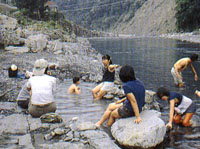 秀峦部落位在白石溪与泰岗溪汇流处,向来以温泉、枫红和溪谷景观着称。  进入村落前,便可看到“控溪吊桥”高悬白石溪两岸,走起来十分刺激;吊桥旁的溪中有块巨岩,状似军舰鸣笛入港,故名军舰岩。秀峦温泉便在上游不远处,水量不大,泉温约摄氏45度,属弱碱性碳酸泉。泉水自溪边乱石中汩汩流出,居民叠石成池,在青山绿水间泡温泉,颇富原始情调。  温泉四周的山峦枫槭甚多,每逢深秋、寒流降临,山头迅速披上火红的外衣,连冬阳也为之失色,称之“枫红的秀峦”,甚为贴切。在山友间久享盛名的霞喀罗古道,是秀峦赏枫的极佳景点,古道由秀峦经锦路、养老、白石,翻过霞喀罗大山鞍部,按石鹿古道通达清泉,途中可欣赏到成片的枫香和其他变叶木。 桂竹是北部泰雅族的重要农产,竹屋自然便成了泰雅族人的建筑特色,村中尚保存着数幢原始竹屋。除了骨架为杉木外,举凡墙面、屋顶、门窗等皆以桂竹为材,由于仍沿用传统的建筑方式,使得秀峦的泰雅竹屋,流露着一股原始古朴之美。 乘车风向标: 无公车直抵,可自竹东包计程车前往。 (来源于:华夏经纬网)