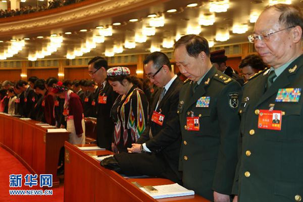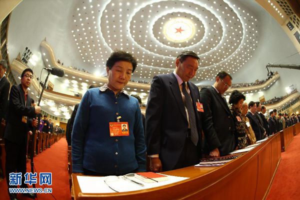 3月3日,中国人民政治协商会议第十二届全国委员会第二次会议在北京人民大会堂开幕。这是全体与会人员为在3月1日晚云南昆明火车站发生的严重暴力恐怖事件中遇难的群众默哀。新华社记者陈建力摄